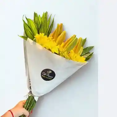 Bouquet de margaritas amarillas y 4 varas de lirios. Nota: La flor puede ser sustituida dependiendo la disponibilidad de color y del producto “Mensaje Personalizado” máximo de 30 caracteres (Dejar el mensaje en el chat, los comentarios no se previsualizan para la tienda por lo que si se dejan allí no podrá ser incluido).