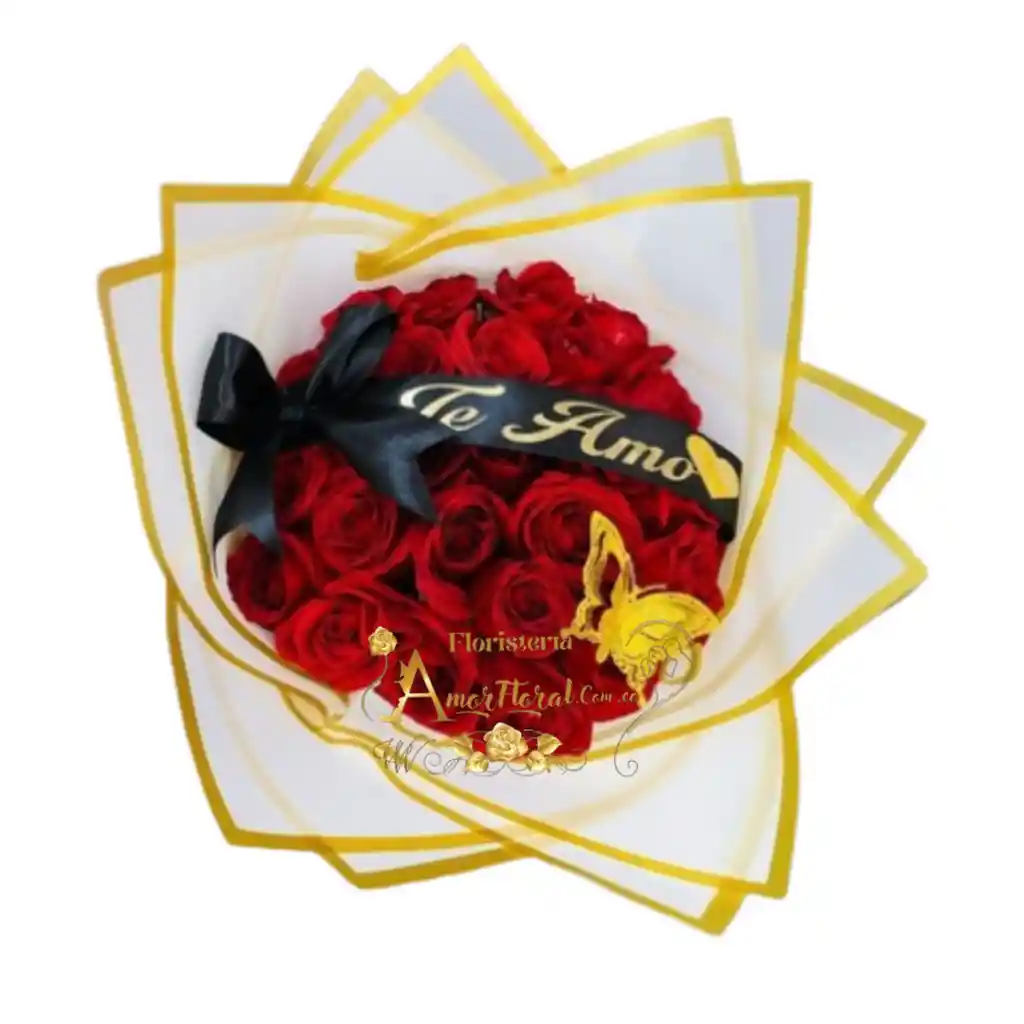 Bouuquet por 24 Rosas, cinta marcada (Te amo), si deseas un mensaje para la tarjeta lo puedes dejar escrito en el área de observaciones o escribirnos al whatsapp al 3143111616 y enviarnos el mensaje para la tarjeta.