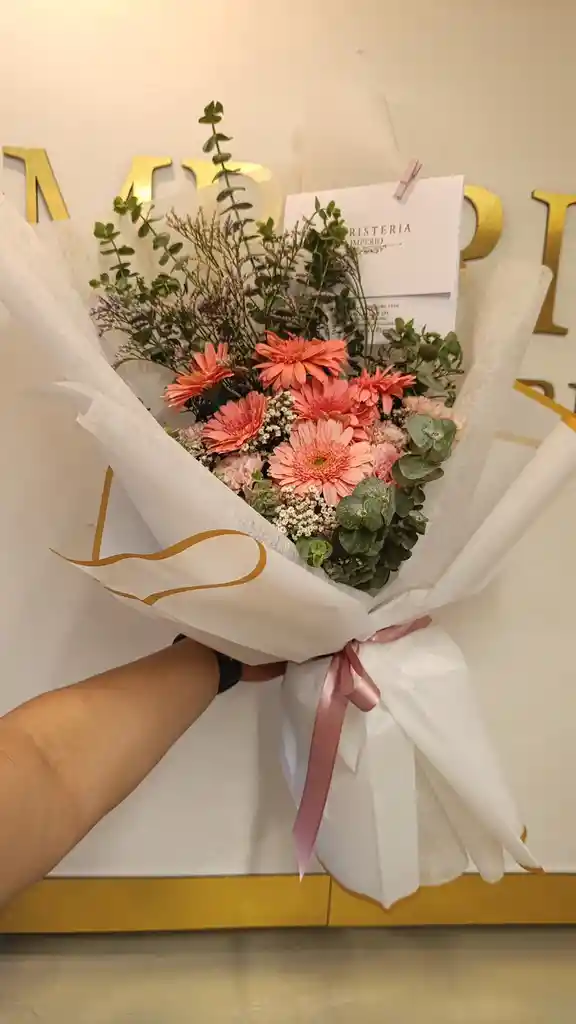 Flores varias, 1 eucalipto, 1 gipsofilia, mensaje personalizado