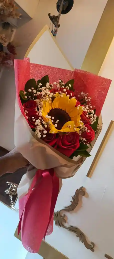 12 rosas rojas, 1 girasol, gipsofilia y rusco