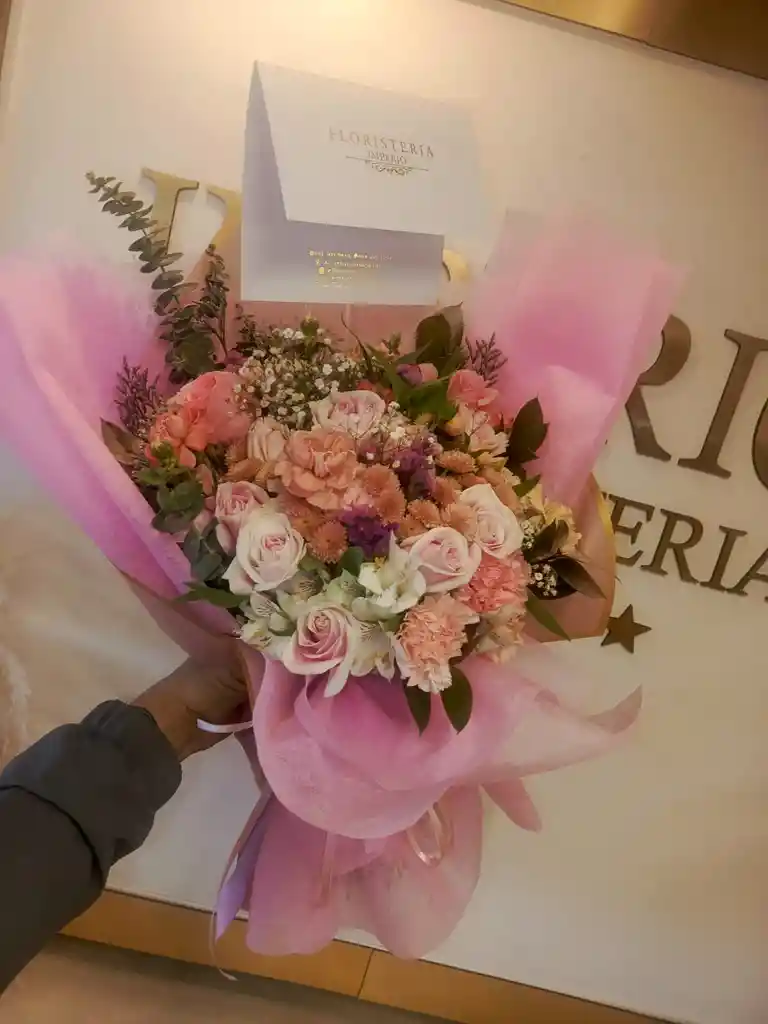Flores varias, 1 atromelia, 1 eucalipto, 9 rosas, 1 rusco, 1 solidago