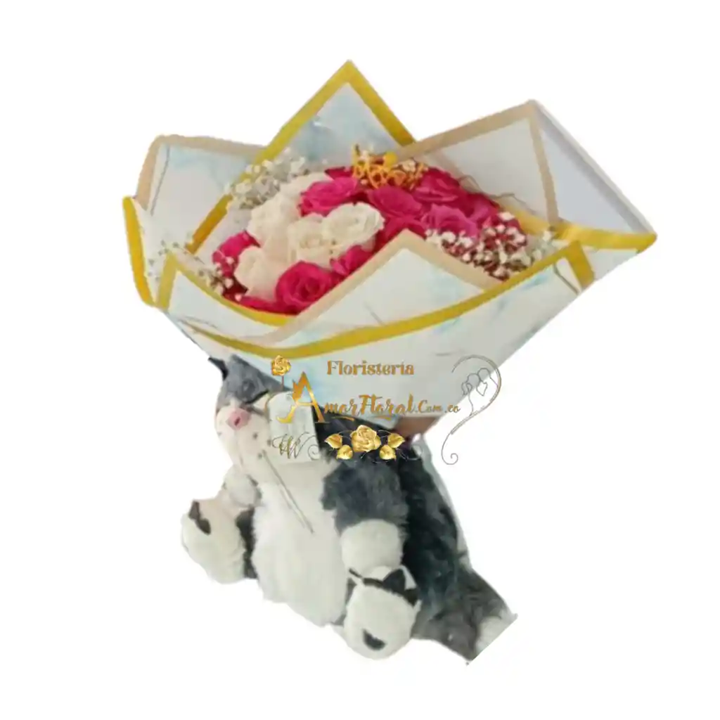 bouquet por 24 rosas, min corona metalizada, peluche de gato lucifer de 30cm, si deseas un mensaje para la tarjeta lo puedes dejar escrito en el área de observaciones o escribirnos al whatsapp al 3143111616 y enviarnos el mensaje para la tarjeta.