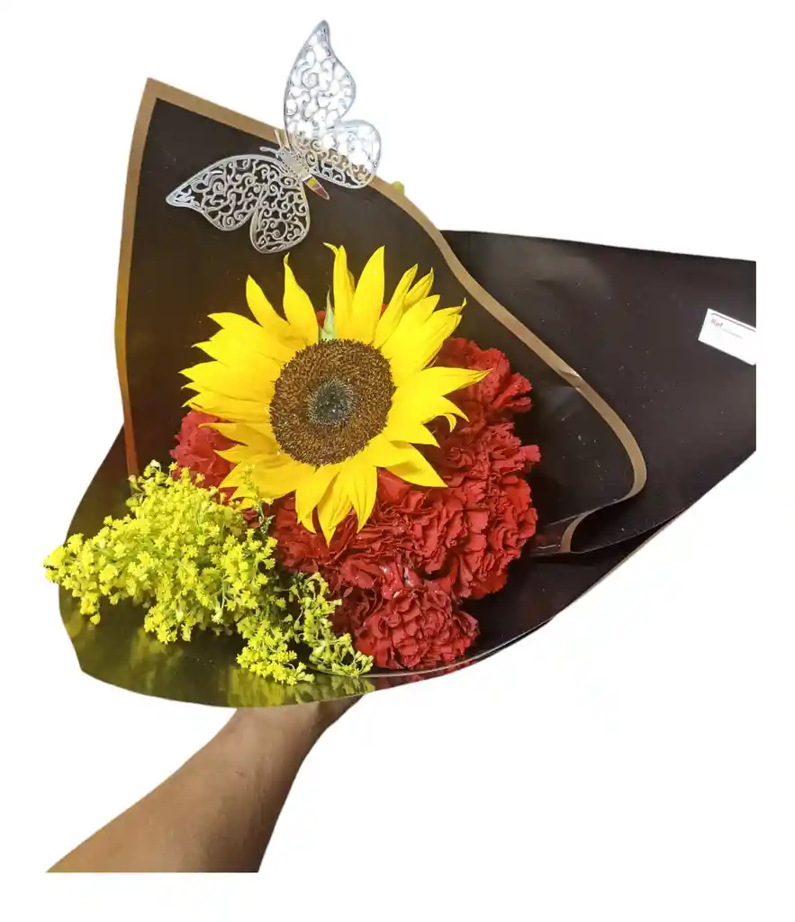 bouquets de clavel rojo, aster, un girasol, envuelto en papel coreano, un moño, el papel coreano puede cambiar según disponibilidad.