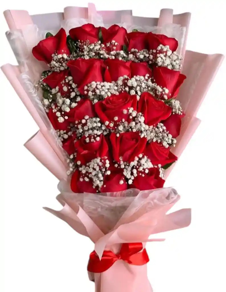 BOUQUET CON 21 ROSAS ROJAS, PERLA , PAPEL DECORATIVO , MOÑO , TERJETA PERSONALIZADA