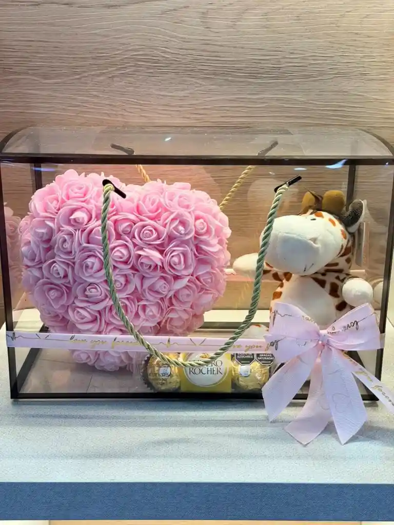 Caja de acetato, contiene un corazón de rosas hechas a mano, chocolates ferrero y un peluche.