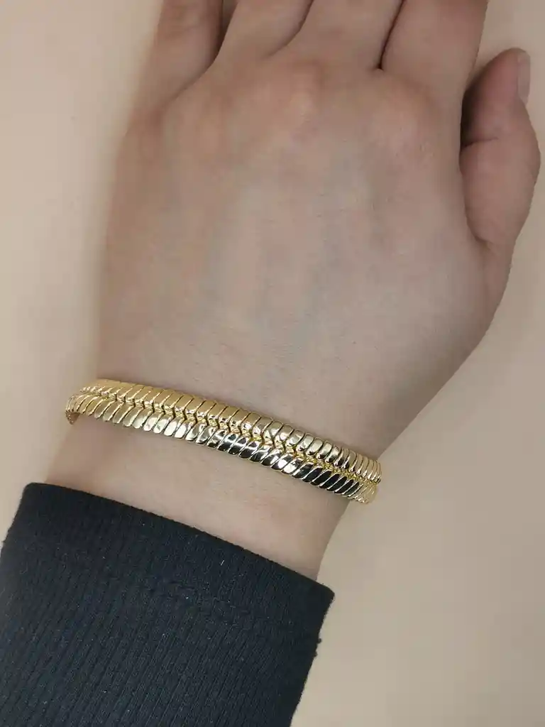 brazalete de estilo italiano con diseño de espiga Esta pulsera es un diseño de cadena de espiga o tipo escama de pez. Se caracteriza por sus eslabones planos y entrelazados que crean una superficie lisa y flexible con un brillo metálico intenso, similar a la textura de una serpiente