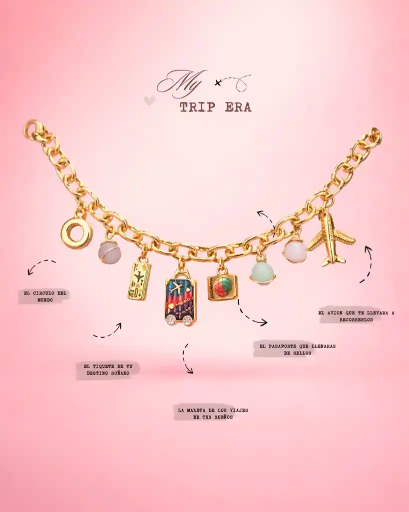 Brazalete en bronce con baño en oro 24ñ y dijes 🌍 El círculo del mundo Representa todos los destinos que aún te esperan. Cada vuelta es un sueño, cada país una historia por vivir. 🎫 El tiquete de tu destino soñado Ese lugar que siempre has imaginado. El primer paso para convertir un sueño en una experiencia real. 🧳 La maleta de los viajes de tus sueños Simboliza la valentía de empacar ilusiones, recuerdos y aventuras. Porque los mejores viajes empiezan con una maleta llena de sueños. 📘 El pasaporte que llenarás de sellos Cada sello es un logro, una emoción y una versión más libre de ti. Tu historia escrita alrededor del mundo. ✈️ El avión que te llevará a recorrerlos Libertad, movimiento y nuevos comienzos. El recordatorio de que el mundo es tan grande como tus ganas de explorarlo.