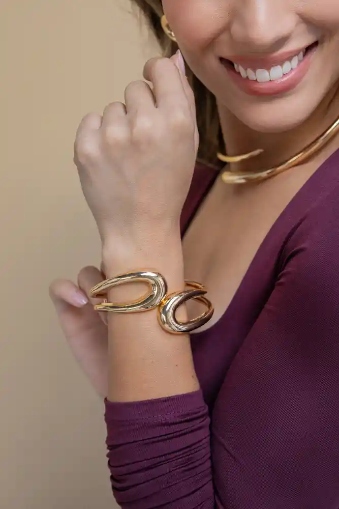 Pulsera dorada en acero con baño en oro de 24k. Incluye: 1 brazalete dorado liso. Recibe con tu compra una FLORIBAG gratis, para que guardes por separado tus accesorios. Hecho a mano en Colombia. * Las imágenes pueden estar ambientadas con otros productos que se venden por separado