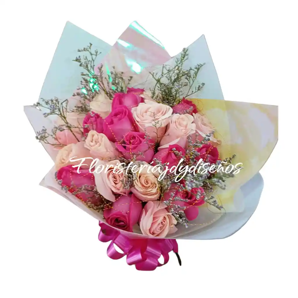 DELICADO BOUQUET EN ROSAS ROSADAS,FUXCIA CON FOLLAJE(CASPIA), ORGANIZADOS EN PAPEL COREANO Y MOÑO EN CINTA DE PAPEL