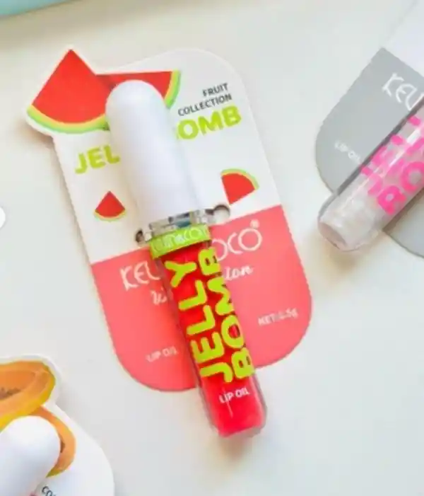 Este es un Lip Oil (aceite para labios) de una colección frutal, diseñado para dar brillo e hidratación. Aquí tienes sus detalles principales: Características del Producto Marca: KEVIN & COCO. Línea: JELLY BOMB - Fruit Collection. Variante: Sandía (Watermelon), identificada por el color rojo vibrante y las ilustraciones en el empaque. Contenido: 2.5 g. Textura: Fórmula tipo "aceite" que proporciona un acabado brillante (glossy) sin ser excesivamente pegajoso como un labial tradicional.