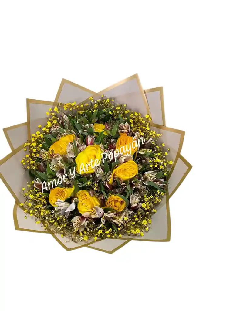 Bouquet de rosas amarillas , con follaje y perla. Incluye: moño, tarjea con mensaje personalizado, aroma, brillo.