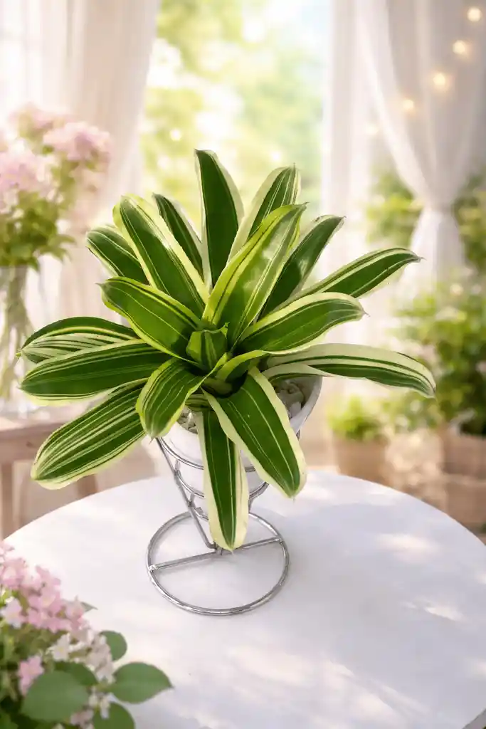 Llena tus espacios de vida y frescura con esta hermosa Bromelia, una planta de follaje elegante con hojas verdes y bordes en tonos crema que aportan un toque moderno y sofisticado. Viene en una base decorativa con soporte metálico, ideal para resaltar su belleza en cualquier rincón de tu hogar u oficina. Es una opción perfecta para regalar o decorar, ya que es resistente, fácil de cuidar y se adapta muy bien a interiores con luz indirecta. ✨ Incluye: Planta Bromelia natural Maceta blanca con piedras decorativas Base metálica moderna 🌿 Cuidados: Luz indirecta Riego moderado Evitar encharcamientos Perfecta para quienes buscan elegancia, frescura y un detalle natural que nunca pasa de moda.