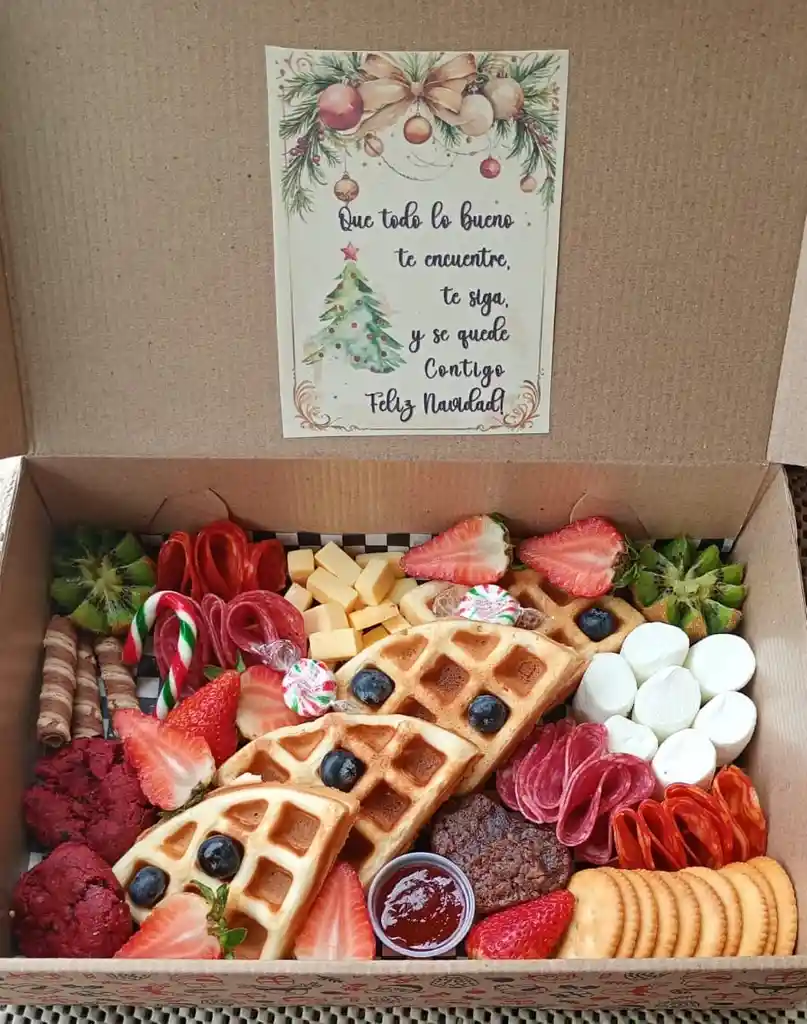 Delicioso box brunch que incluye, fresas, kiwi, arandanos, brownie, queso gouda y carnes frias, 4 waffles, crema de avellanas, masmelos, caramelos navidad galletas dulces, galletas saladas, caja de navidad