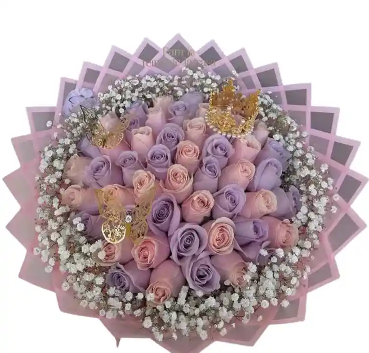 Ramo buchón de rosas pastel Un impresionante ramo con 50 rosas en tonos pastel y gypsophila , envuelto con elegancia para sorprender con su belleza sutil y delicada. Nota: La flor puede ser sustituida dependiendo de la disponibilidad de color y del producto. "Mensaje Personalizado" máximo de 30 caracteres (Dejar el mensaje en el chat, los comentarios no se previsualizan para la tienda, por lo que si se dejan allí no podrá ser incluido).