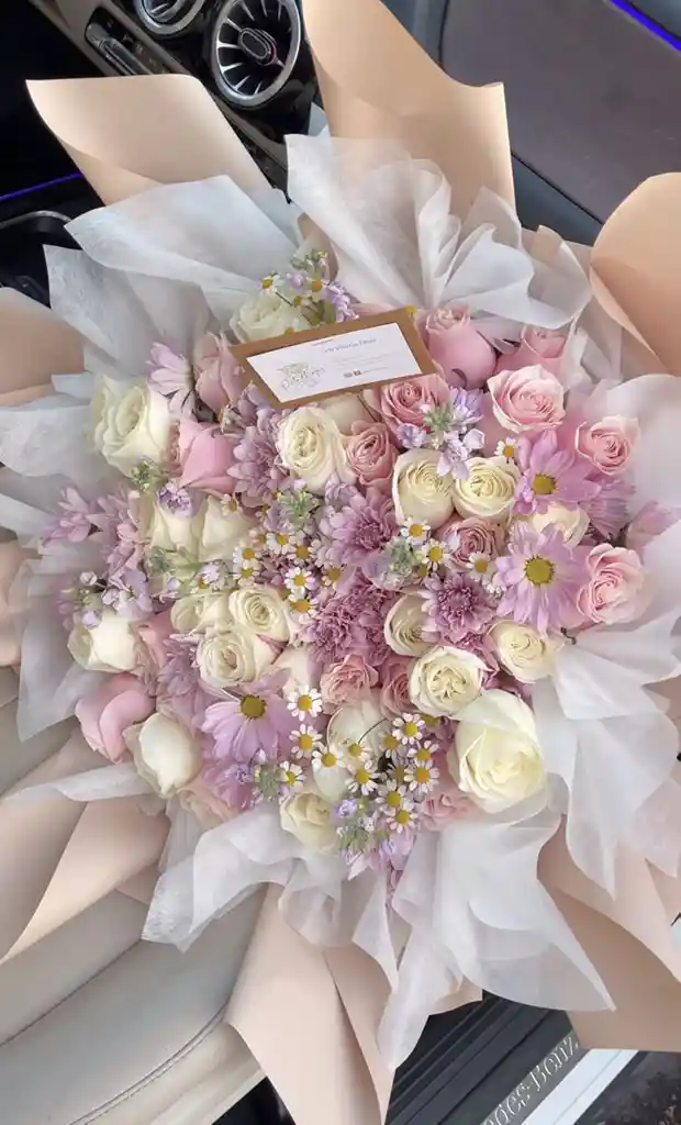 Buchón lila de 40 rosas y 5 gérberas Nota: La flor puede ser sustituida dependiendo la disponibilidad de color y del producto “Mensaje Personalizado” máximo de 30 caracteres (Dejar el mensaje en el chat, los comentarios no se previsualizan para la tienda por lo que si se dejan allí no podrá ser incluido).