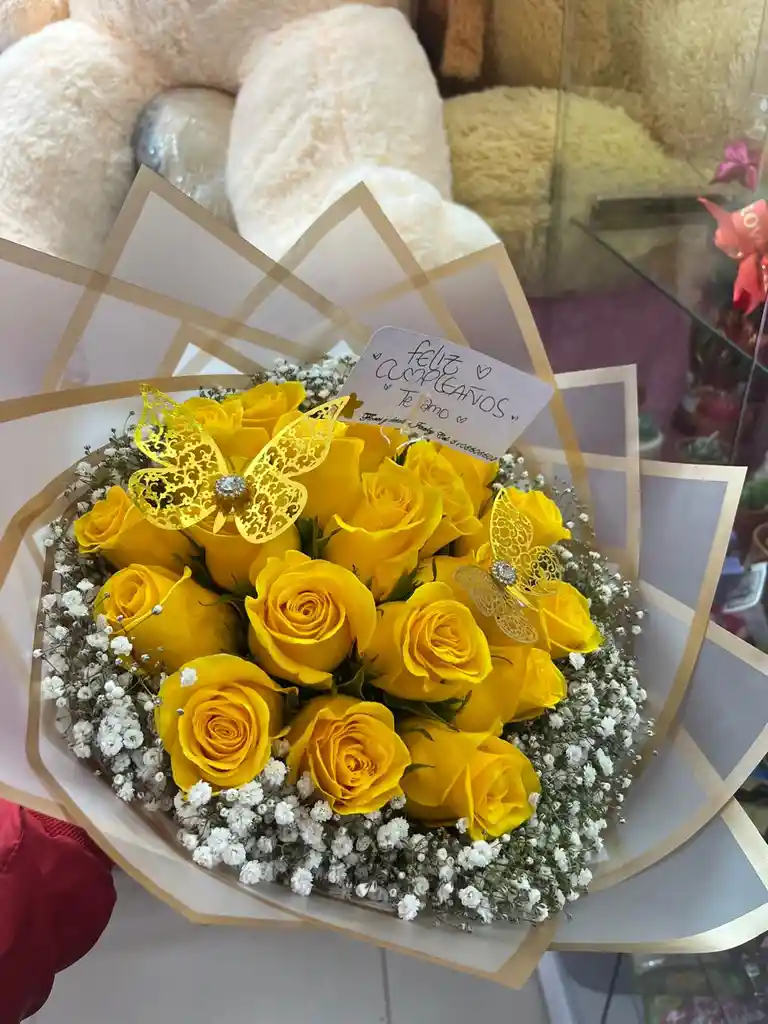 Ramo tipo buchón con 19 rosas, gypsophylia, mariposas decorativas, envoltura en papel coreano y tarjeta personalizada. *Rosas colores según disponibilidad*