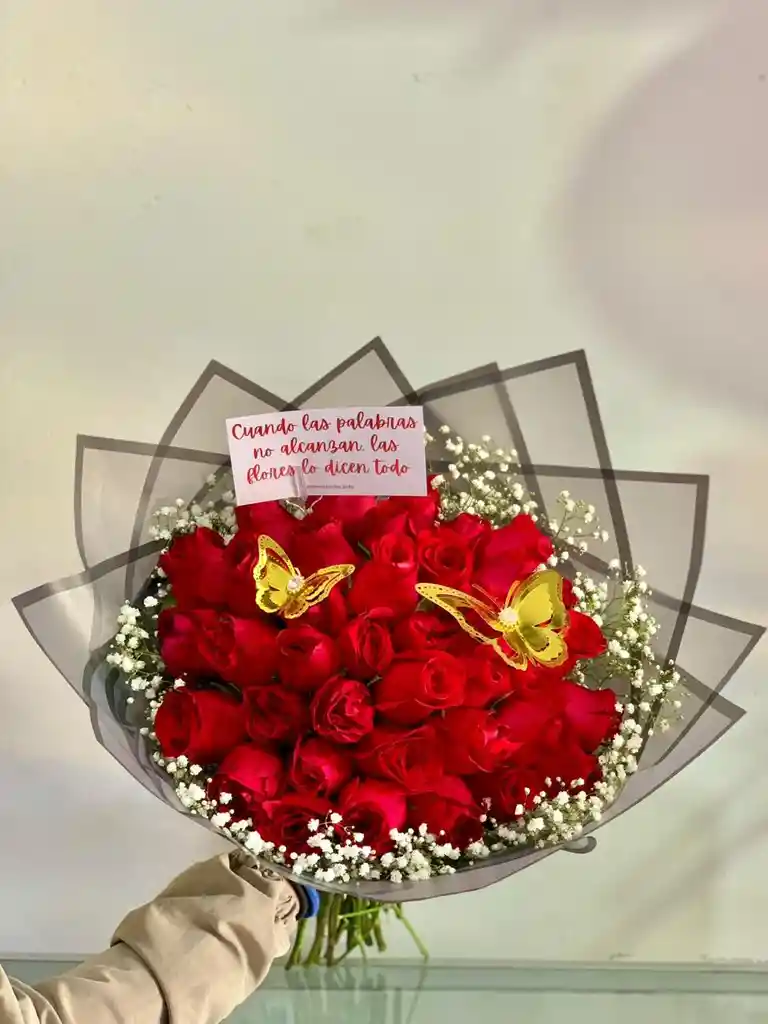 Ramo tipo buchon x56 rosas, gipso al rededor, envoltura especial en papel regalo , mariposas decorativas y tarjeta personalizada.
