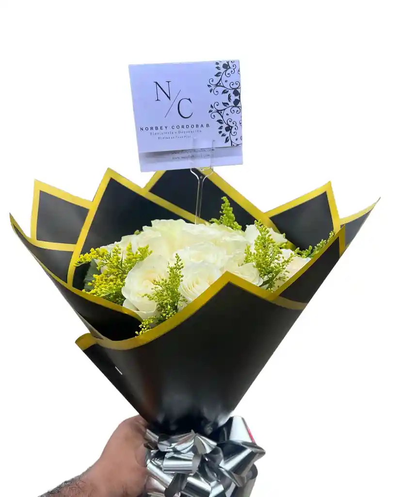 buque elaborado con 12 rosas blancas y papel coreano negro con moño plateado decorativo