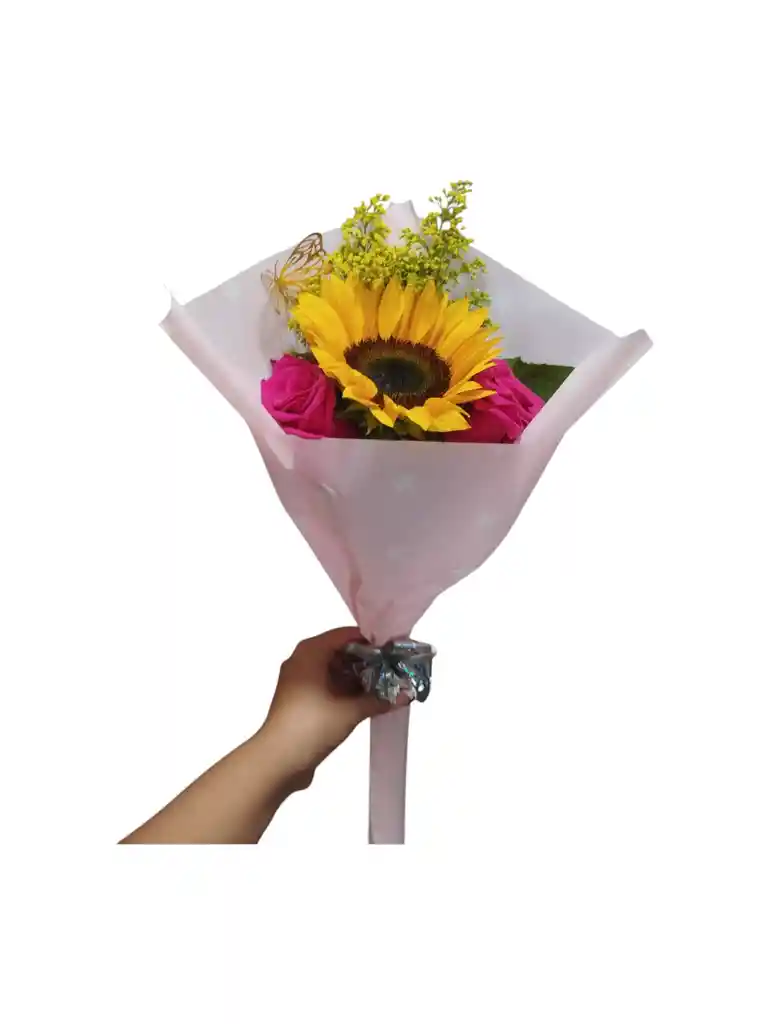 Buquet de dos rosas, 1 girasol, aster, moño, mariposa y papel coreano (este varia dependiendo disponibilidad )