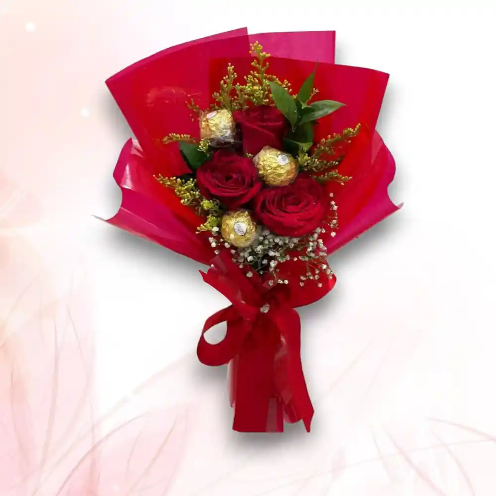 Hermoso bouquet de rosas rojas acompañado de chocolates Ferrero Rocher, decorado con elegante envoltura roja y moño romántico. Perfecto para regalar en ocasiones especiales.