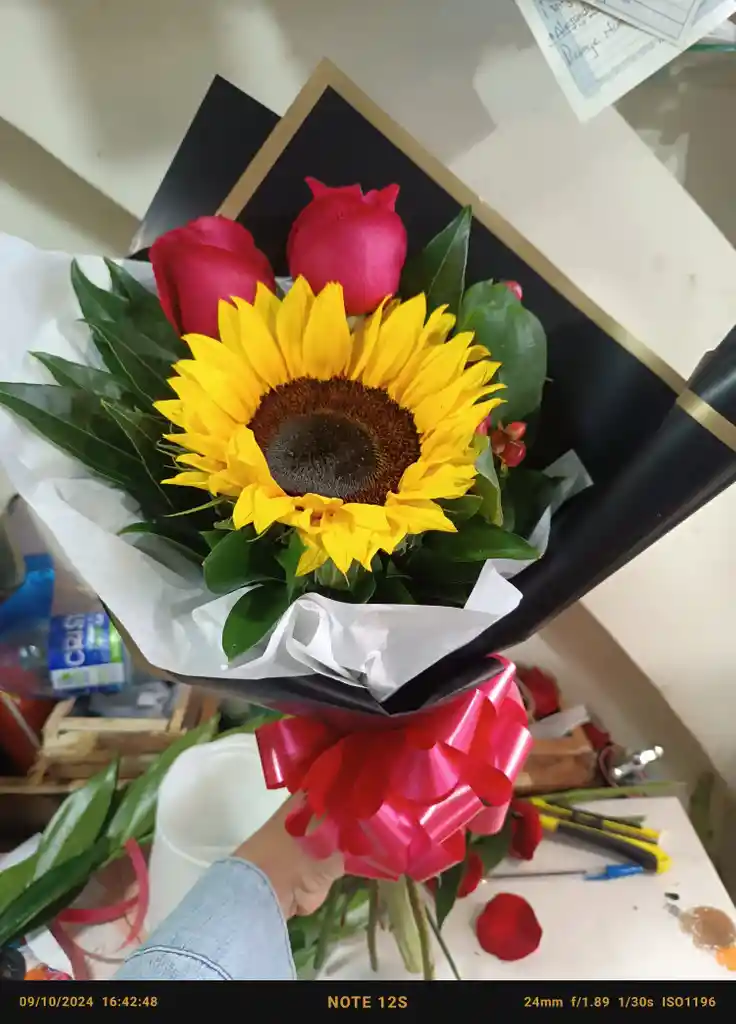 BUQUET PEQUEÑO CON 3 ROSAS Y UN GIRASOL DECORADO EN PAPEL ESPECIAL