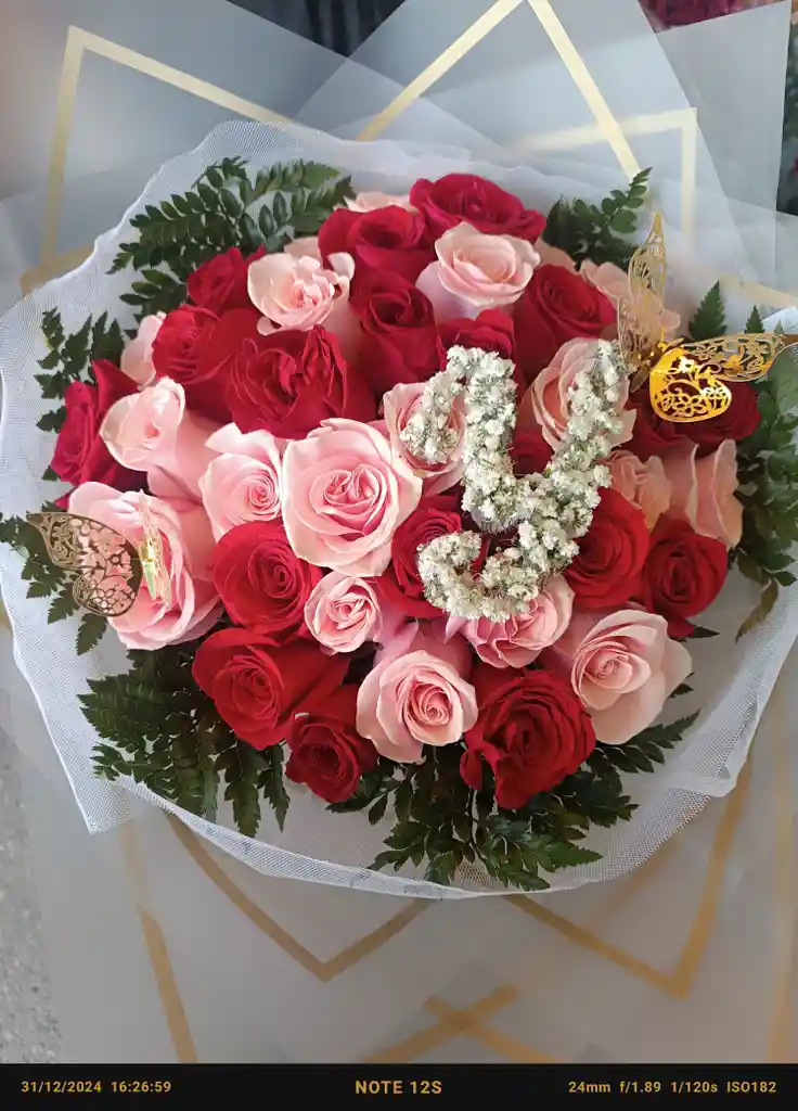 BUQUET BUCHON PEQUEÑ CON ROSASCOMBINADAS EN ROSAS ROJAS Y ROSADAS,CON LA INICIAL QUE DESEES Y UN CORAZON EN YIPSO