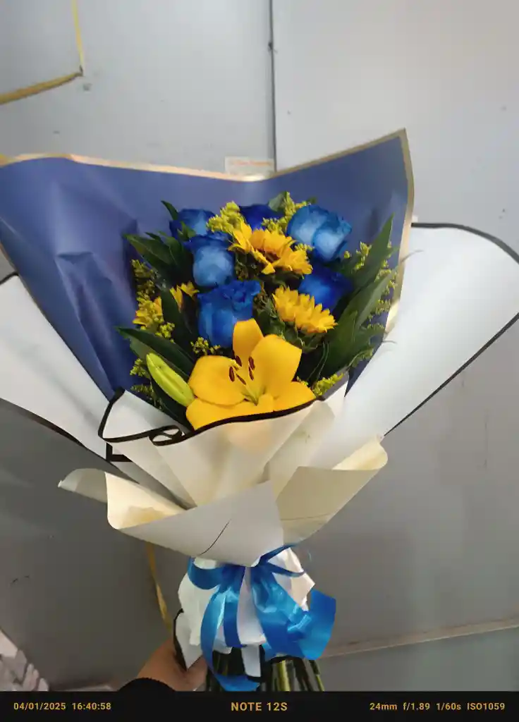 BUQUET DE ROSAS AZULES CON GIRASOLES