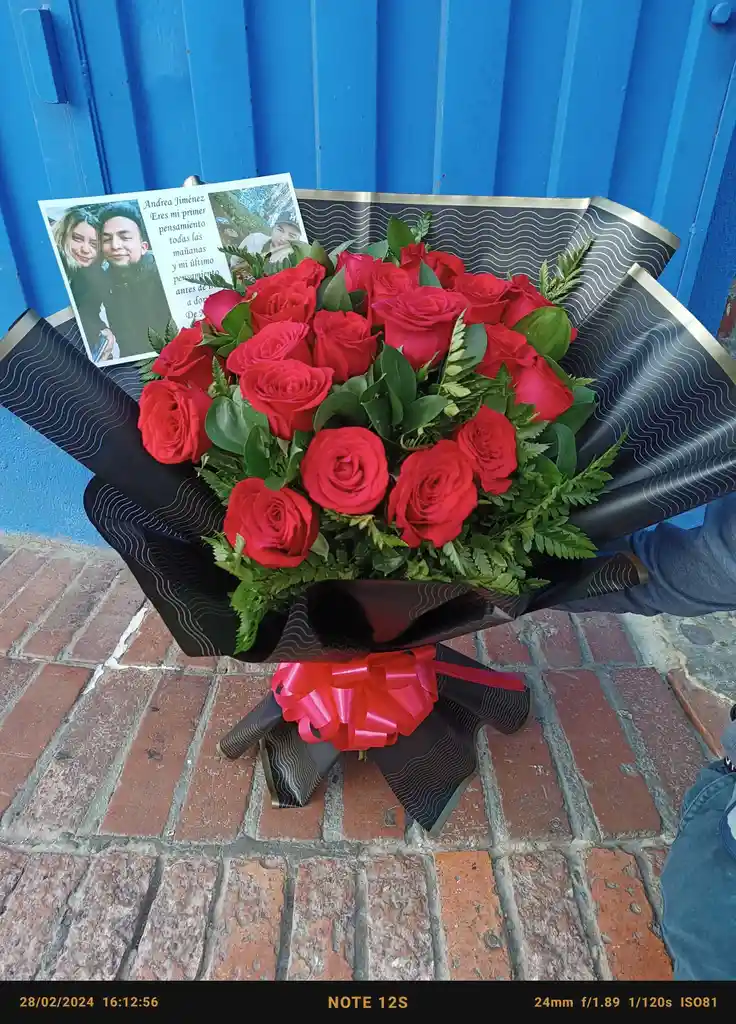 BUQUET EN ROSAS ESPECIAL CON DOS DOCENAS DE ROSAS, DECORACION EN PAPEL IMPORTADO CON TARJETA EN PAPEL FOTOGRAFICO CON FOTO
