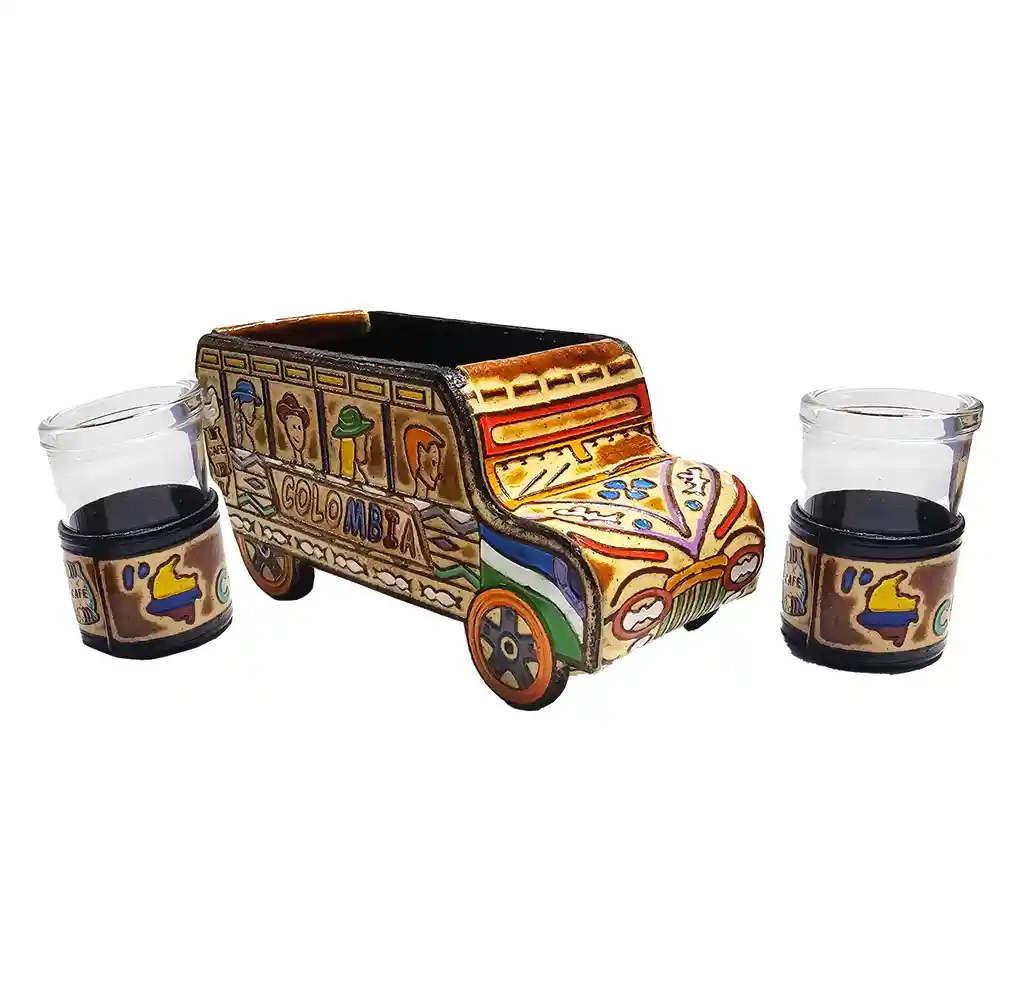 El juego de estos exclusivos vasos está acompañado de un estuche con forma de la reconocida chiva colombiana, cada vaso de cristal esta cubierto desde su base hasta la mitad aproximadamente con un adorno de cuero que lo protege, esta cubierta puede ser retirada a la hora de lavar los vasos para conservar el cuero en perfectas condiciones. los vasos van con un tamaño moderado ideal para bebidas pequeñas, este tipo de artesanias decorativas marcan tendencia en la actualidad con diseños exclusivos, modernos que podrás colocar en tu hogar o establecimiento disfrutando de las bebidas que mas te gustan. Ficha Tecnica: Dimensiones de los vasos (Altura x Diámetro de la boca) : 4,5 cm x 3 cm Material de los vasos: Cristal Cubierta de los vasos: Cuero Dimensiones de la chiva (Largo x Alto x Ancho): 10,5 cm x 8,5 cm x 4 cm Material de la chiva: Cuero - Madera Términos de garantía: Para defectos de fábrica o retractos: Por favor revise el producto apenas lo reciba y antes de usarlo. No aplican ley de retracto o defectos de fábrica luego de usar el producto. Se manejan máximo 5 días para reportar defectos de fábrica (por ejemplo, producto funciona mal, piezas faltantes, rotas, etc). Para hacer efectiva la devolución el producto debe devolverse con el empaque original, el cual debe estar en buen estado, incluir todos los documentos y las partes completas y sin daños. Los cuidados y recomendaciones para mantener un producto en buen estado son los siguientes: No aplicarle perfumes ni cremas directamente, no mojarlos, no dejarlos caer y procurar limpiarlos para retirar suciedad. Garantía del vendedor: 1 meses