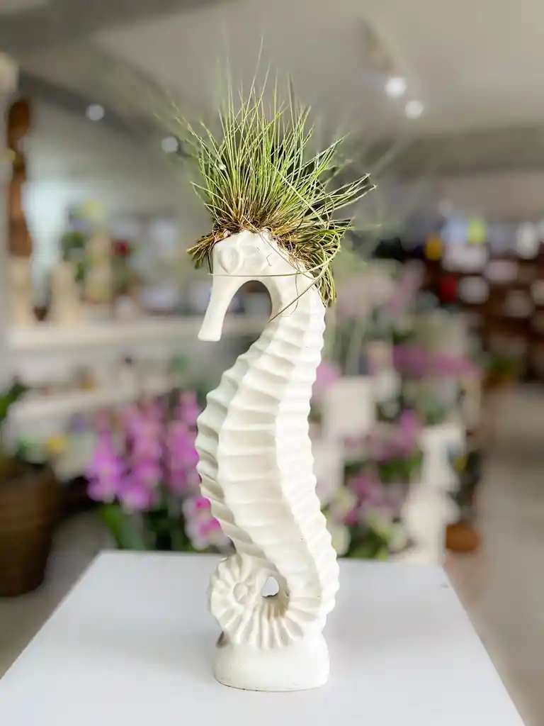 Caballito de Mar con Tillandsia (Planta de Aire) Una pieza decorativa única que combina la elegancia del caballito de mar en cerámica con la frescura natural de una Tillandsia, también llamada planta de aire. Su diseño crea un efecto artístico y moderno, perfecto para dar un toque diferente a cualquier espacio. La Tillandsia es una planta epífita que no necesita tierra para vivir. Absorbe humedad y nutrientes directamente del ambiente, lo que la convierte en una opción ideal para decoraciones creativas y de bajo mantenimiento. Además, es reconocida por aportar una sensación de frescura y ligereza, siendo perfecta para interiores iluminados y ambientes relajados. Su forma estilizada y su composición minimalista hacen de esta pieza un regalo original o un elemento decorativo llamativo que destaca por sí mismo. Nota: Ubicar en un espacio con buena iluminación y pulverizar ligeramente la Tillandsia dos o tres veces por semana para mantenerla saludable. No requiere sustrato ni riego directo.