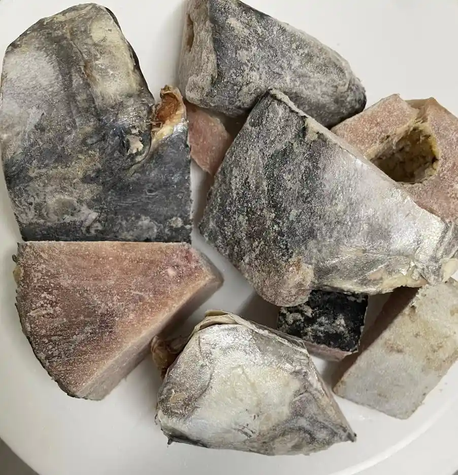 Cabeza y hueso de diferentes especies de pescado porcionada en trozos pequeños, empacado en bolsas transparentes, con peso entre 1000 y 1050 g