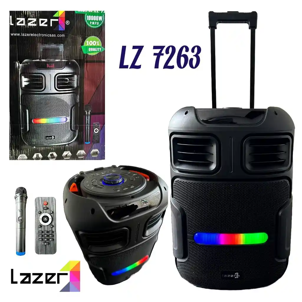 LZ 7263 El parlante de 12 pulgadas LZ-7263 con 10,000 w de potencia es la opción definitiva para quienes buscan un sistema de audio que no solo ofrezca un sonido excepcional, sino que también añada un toque de estilo y ambiente a cualquier evento. Con su diseño elegante en color negro, pantalla LED e indicador inteligente, este parlante te brinda una experiencia auditiva y visual incomparable, viene con micrófono y control remoto. Características destacadas: 1. Sonido potente y claro: Equipado con tecnología de punta, el LZ-7263 ofrece un sonido potente y cristalino que te sumerge por completo en tu música favorita. 2. Pantalla LED e indicador inteligente: La pantalla LED y el indicador inteligente proporcionan información clara y útil sobre el estado del parlante y la pista que está sonando, mejorando tu experiencia de usuario. 3. Barra de luz LED ajustable: Con una barra de luz LED que cambia de colores al ritmo de la música, puedes crear el ambiente perfecto para cualquier ocasión. Además, puedes ajustar la barra de luz a tu preferencia para personalizar aún más tu experiencia. 4. Diseño funcional y portátil: Con una práctica manija, ruedas y un soporte para micrófono integrado, el LZ-7263 es fácil de transportar y configurar en cualquier lugar, garantizando una máxima comodidad y versatilidad. 5. Control total al alcance de tu mano: El tablero controlador ubicado en la parte superior del parlante te permite ajustar fácilmente el volumen, cambiar de pista, controlar la iluminación LED y más, todo con solo tocar un botón. 6. Voltaje de potencia adaptable: Con un voltaje de potencia de AC 110-220V, este parlante es compatible con una amplia gama de sistemas eléctricos, asegurando un rendimiento óptimo donde quiera que vayas. 7. Dimensiones compactas y peso ligero: Con unas medidas de 38 cm de profundidad, 37 cm de ancho y 57 cm de alto, y un peso de solo 6,8 kg, este parlante es fácil de transportar y almacenar sin sacrificar su rendimiento.