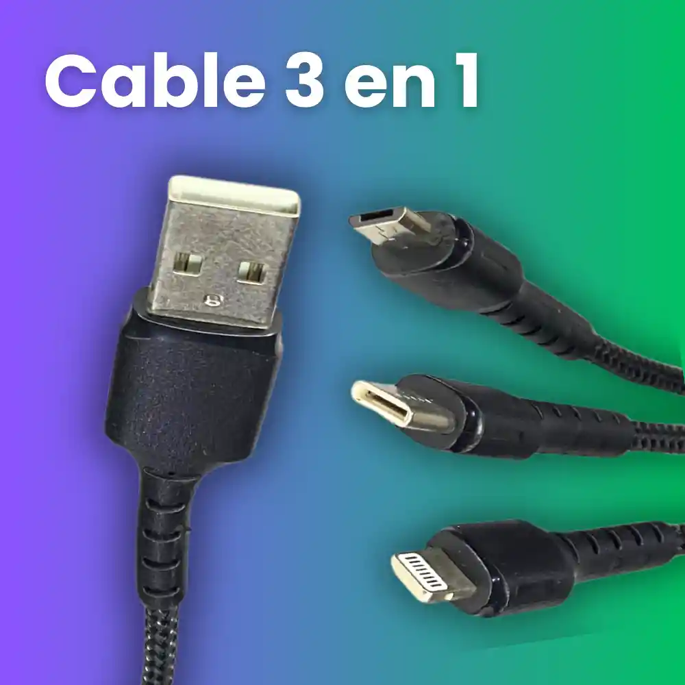 Un solo cable para cargar todos tus dispositivos. El PZX V136 combina Lightning, Tipo C y Micro USB en un diseño resistente, trenzado y con carga rápida de 3.1A. Perfecto para llevar en el bolso, el carro o usar en casa sin enredos. ⚙️ Características principales: ✦ 3 en 1: Lightning, USB Tipo C y Micro USB. ✦ Carga rápida 3.1A para dispositivos compatibles. ✦ Cable trenzado resistente, anti-nudos y mayor durabilidad. ✦ Conectores reforzados para evitar rupturas. ✦ Compatible con celulares, audífonos, parlantes, controles, power banks y más. ✦ Longitud cómoda de 1.2 metros (1200 mm). 📦 Incluye: ✦ 1 Cable 3 en 1 PZX V136 con conectores Lightning + Tipo C + Micro USB. 📐 Especificaciones técnicas: ✦ Modelo: V136 ✦ Marca: PZX ✦ Entrada: USB ✦ Salidas: Lightning / USB Tipo C / Micro USB ✦ Potencia máxima: 3.1A ✦ Longitud: 1.2 m ✦ Material: Cable trenzado de nylon + conectores reforzados ✦ Color: Negro ✦ Compatibilidad: iPhone, Android, tablets, accesorios electrónicos, power banks, etc. 💡 Ideal para: ✦ Personas con varios dispositivos y diferentes conectores. ✦ Uso diario en casa, oficina o carro. ✦ Viajes: reduce cables y ahorra espacio. ✦ Cargar simultáneamente distintos equipos sin cambiar de cable.