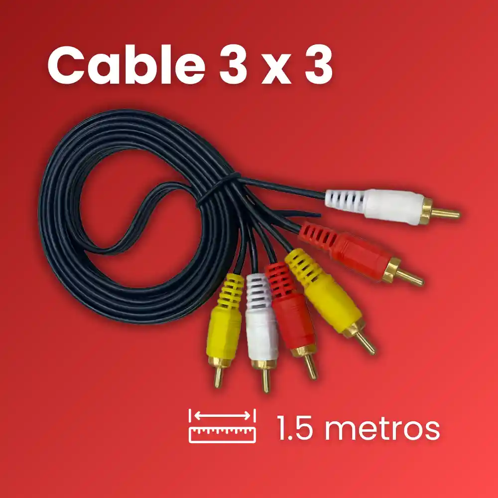 El Cable 3 x 3 marca TM es la solución ideal para transmitir audio y video de forma confiable entre tus dispositivos electrónicos. Diseñado con conectores RCA de colores (rojo, blanco y amarillo) que facilitan la identificación de cada señal, este cable ofrece una conexión estable y clara para equipos de entretenimiento y sonido. Características principales: 📀 Audio y video RCA (3x3): conectores diferenciados por color para mayor facilidad de uso. 📏 Medida disponible: 1.5 metros, perfecto para instalaciones prácticas y ordenadas. 💪 Alta resistencia y durabilidad: fabricado con materiales de calidad para soportar el uso constante. 🔊 Conectores metálicos con puntas doradas que aseguran una mejor conductividad y reducción de interferencias. 🎨 Cubierta de PVC flexible y resistente para mayor vida útil. Usos recomendados: • Conectar DVD, televisores, consolas de videojuegos y equipos de sonido. • Ideal para teatros en casa, reproductores antiguos y dispositivos con salida RCA. • Perfecto para quienes necesitan una conexión rápida y confiable de audio estéreo y video compuesto. Con este cable podrás disfrutar de tus contenidos favoritos con una excelente transmisión, manteniendo la calidad original del sonido y la imagen.