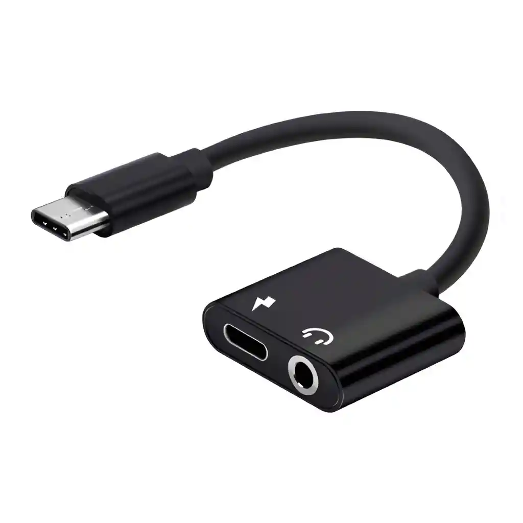 Adaptador de carga y audio USB-C. Calidad de sonido y carga rápida. Material: carcasa de aluminio. Color: negro o plateado. NOTA: No es compatible con SAMSUNG.