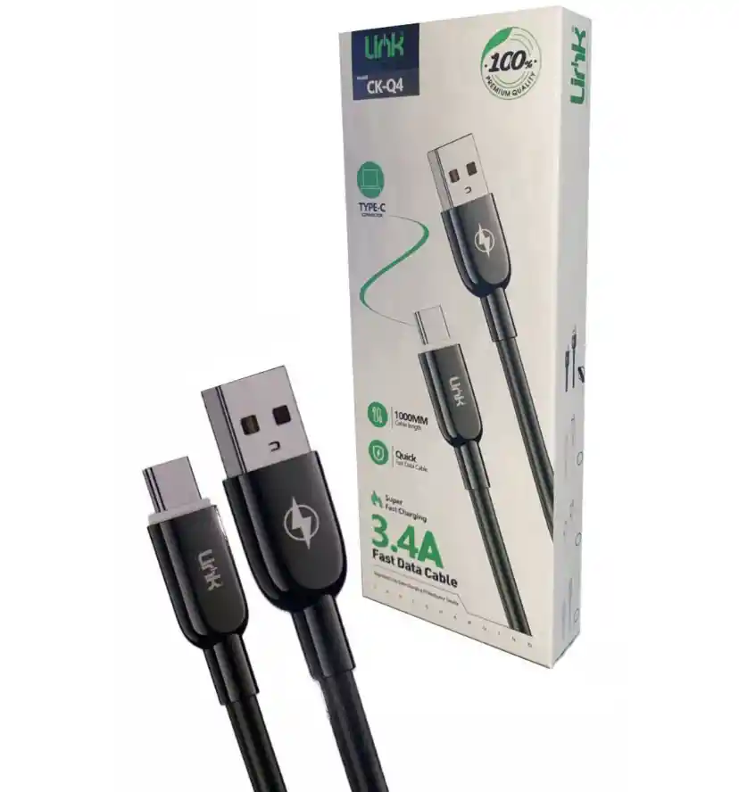 Cable Link CK-Q4 con salida de 3.4A y conector Tipo C. Permite carga rápida y transferencia de datos estable. Ideal para uso diario en hogar, oficina o vehículo. El Cable Tipo C Link CK-Q4 está diseñado para ofrecer una carga rápida, segura y una transferencia de datos eficiente. Con una potencia de salida de hasta 3.4 amperios, garantiza una carga veloz compatible con la mayoría de dispositivos Android y accesorios con entrada Tipo C. Fabricado con materiales resistentes y flexibles, su revestimiento TPE ofrece durabilidad y protección frente al desgaste diario. Los conectores reforzados aseguran una conexión firme y estable, reduciendo la posibilidad de fallos o interrupciones durante el uso. -Características técnicas: • Tipo de conector: USB a Tipo C • Potencia de salida: 3.4A (compatible con carga rápida) • Longitud: 1 metro • Transferencia de datos: alta velocidad y estabilidad • Material: recubrimiento TPE flexible y resistente • Protección inteligente contra sobrecarga y cortocircuitos • Uso recomendado: hogar, oficina y vehículo • Compatibilidad: dispositivos con entrada Tipo C (Samsung, Xiaomi, Motorola, Huawei, Oppo, Realme, Lenovo, entre otros) -Beneficios: • Carga rápida y segura para teléfonos y tablets • Alta eficiencia en la transmisión de datos • Materiales de larga duración con conectores reforzados • Ideal para uso continuo y transporte frecuente. -Color: Negro y Blanco. (SE ENVIA COLOR DISPOBLE DEACUERDO AL INVENTARIO DE LA TIENDA).