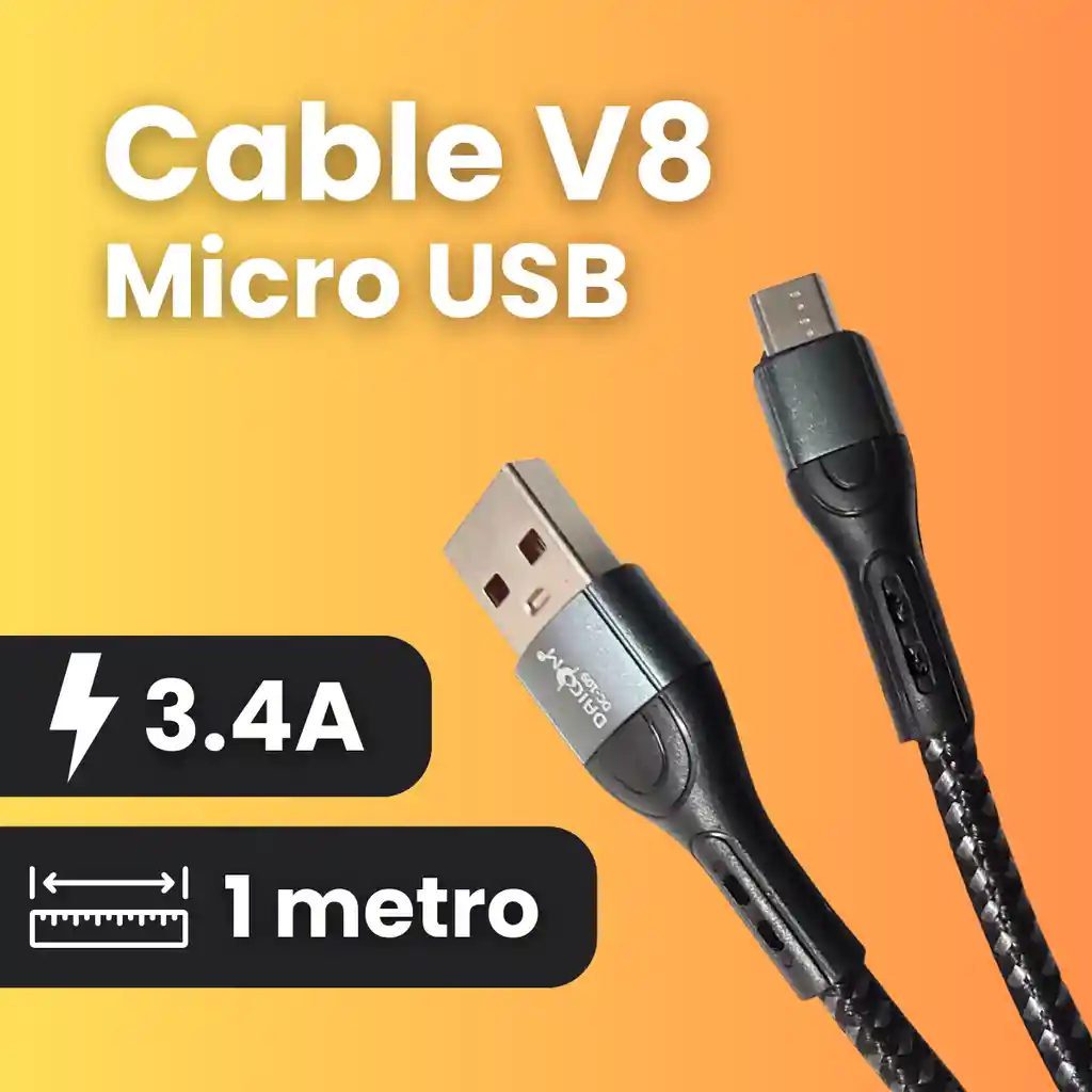 El Cable DAICOM DC-109 V8 es la elección perfecta para quienes buscan velocidad, durabilidad y seguridad al cargar o transferir datos entre sus dispositivos. Diseñado con materiales de alta calidad, garantiza una conexión estable y una carga rápida de hasta 3.4A, ideal para mantener tus equipos siempre listos. ⚙️🚀 ⚙️ Características técnicas 🔋 Tipo de conector: V8 (Micro USB). ⚡ Potencia de salida: 3.4A (Carga rápida). 📏 Longitud: 1 metro (100 cm). 🧵 Material: Fabricado con materiales importados de alta calidad. 🛡️ Protección avanzada: Protege perfectamente tus dispositivos digitales contra sobrecargas o fluctuaciones eléctricas. 💪 Diseño resistente: Cubierta trenzada y conectores reforzados para una mayor durabilidad. 🎨 Estilo moderno: Acabado elegante y profesional con diseño ergonómico. 🏷️ Modelo: DC-109. 🌍 Fabricado en: China. 🌟 Ventajas principales ⚡ Carga rápida y eficiente: Reduce el tiempo de carga gracias a su salida de 3.4A. 🔄 Transferencia de datos estable: Ideal para sincronizar archivos entre dispositivos. 💼 Compatibilidad universal: Funciona con la mayoría de smartphones, tablets, power banks y otros equipos con puerto Micro USB. 💪 Diseño reforzado: Cable trenzado y conectores firmes que evitan rupturas o dobleces. 🔐 Seguridad garantizada: Materiales de alta calidad que protegen tus dispositivos ante sobrecorrientes o sobrecalentamiento. 💡 Usos recomendados ✅ Cargar smartphones Android, tablets, parlantes, cámaras o dispositivos con entrada Micro USB. ✅ Conectar tu celular al computador para transferir fotos, videos o música. ✅ Ideal para el uso diario en casa, oficina o viajes. ✈️🏠💼 El Cable DAICOM DC-109 V8 combina potencia, resistencia y estilo en un solo accesorio. Su construcción robusta y su capacidad de carga rápida de 3.4A lo convierten en un cable confiable y duradero para todas tus necesidades tecnológicas. 🔌⚙️🔥