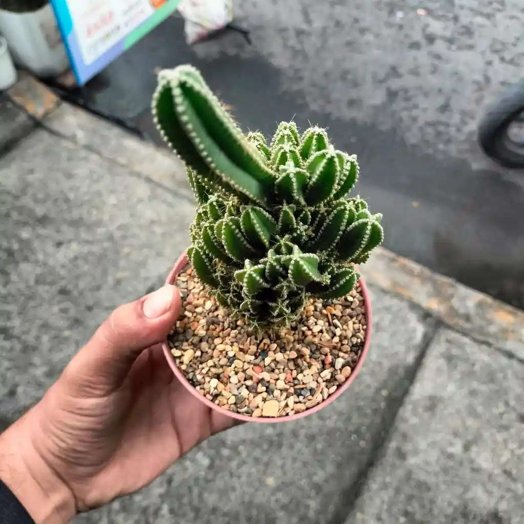 Tipo: Cactus columnar. Altura: Puede crecer hasta 2-3 metros en su hábitat natural, pero en maceta suele mantenerse más pequeño, alcanzando de 30 a 90 cm de altura. Tallos: De forma vertical y ramificada, los tallos son verdes y angulados (en forma de cuatro o cinco lados), de ahí el término tetragonus (cuatro ángulos). Espinas: Tiene espinas cortas y delgadas a lo largo de las costillas del tallo, que suelen ser de color blanco o marrón. Flores: Las flores, aunque raras en cultivo, son grandes y blancas, abriéndose principalmente durante la noche.