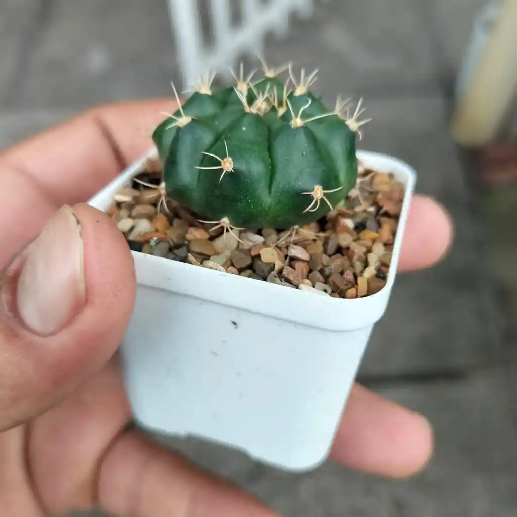 Descripción: Los Gymnocalycium son generalmente pequeños, midiendo entre 4 y 15 cm de diámetro. El nombre del género significa "cáliz desnudo", refiriéndose a los botones florales sin pelo ni espinas. Distribución: Esta especie tiene una amplia distribución en Paraguay, el sureste de Brasil, el sur de Bolivia y el norte de Argentina. Luz: Se recomienda buena iluminación, pero se debe evitar el sol directo de la tarde, que puede causar quemaduras solares. Agradecen varias horas de sol directo a primeras horas de la mañana o últimas de la tarde.