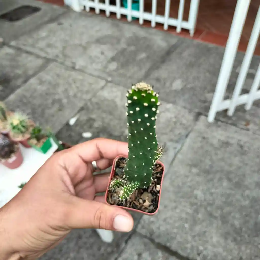 Es un arbusto de 2-4 (6) m de altura, tronco de 2 m de diámetro, copa profusamente expandida en ramas. Artejos ovados-oblongos, 1-3 dm de largo, verde brillantes, raramente variegados. Hojas subuladas; espinas solas o en pares de 1-4 (6) cm de largo, desde blancas, parduzcas a pardo rojizas. Flores amarillas o rojizas, hasta 8 cm de diámetro; sépalos anchos, pétalos abiertos; estilos y estigmas blancos. Ovario de 4 cm, inerme. Fruto ovoide, 5-8 cm de largo, rojo, inerme.