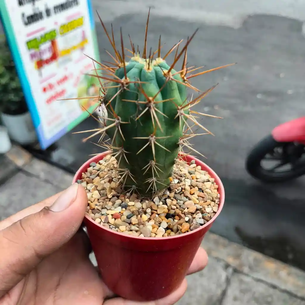 Descripción: Es un cactus arborescente originario de Sudamérica, específicamente Argentina, que en su hábitat natural puede alcanzar hasta 12 metros de altura. Los ejemplares jóvenes, como el de la imagen, crecen en forma de columna. Apariencia: Se caracteriza por sus tallos de color verde azulado que se vuelven gris verdoso con la edad. Posee costillas prominentes y areolas lanosas. Espinas: Lo más distintivo son sus espinas largas y rígidas. Cuenta con una espina central robusta (que puede medir hasta 8 cm) y varias espinas radiales. Las espinas son inicialmente negras o de color marrón amarillento, volviéndose blancas con la punta oscura con el tiempo.