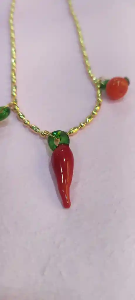 ¡Descubre el accesorio perfecto para darle un toque único a tu estilo! Esta hermosa cadena en rodio combina sofisticación y frescura, con un brillo espectacular que resalta en cualquier ocasión. Lo que la hace realmente especial son sus dijes de vidrio, que representan pequeños pimientos rojos y una fruta naranja, cada uno con delicados detalles de hojas verdes. Esta pieza no solo es un collar, ¡es una declaración de estilo! Su diseño divertido y vibrante aporta un aire juguetón pero elegante, ideal para quienes buscan destacar con un toque de originalidad. No dejes pasar la oportunidad de llevar contigo una joya que combina arte, color y un diseño único. ¡Es el accesorio que te hará brillar y robar todas las miradas!