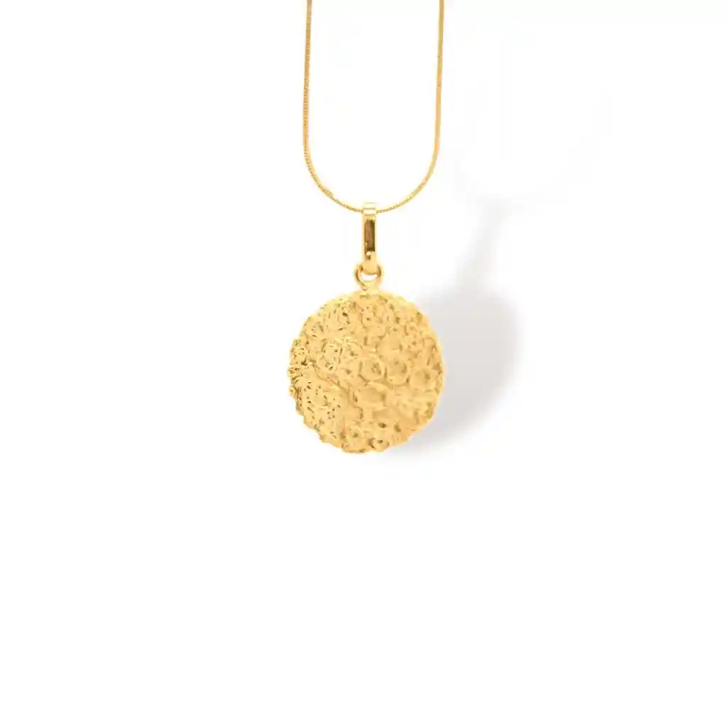 Un collar lujoso y extraordinario, elaborado con materiales de alta calidad. Hecho a mano al estilo precolombino, esta belleza luce detalles en bronce chapado en oro de 24 kilates. Cuenta con un colgante central que representa los cráteres de la luna. Imprescindible para cualquier amante de la joyería.