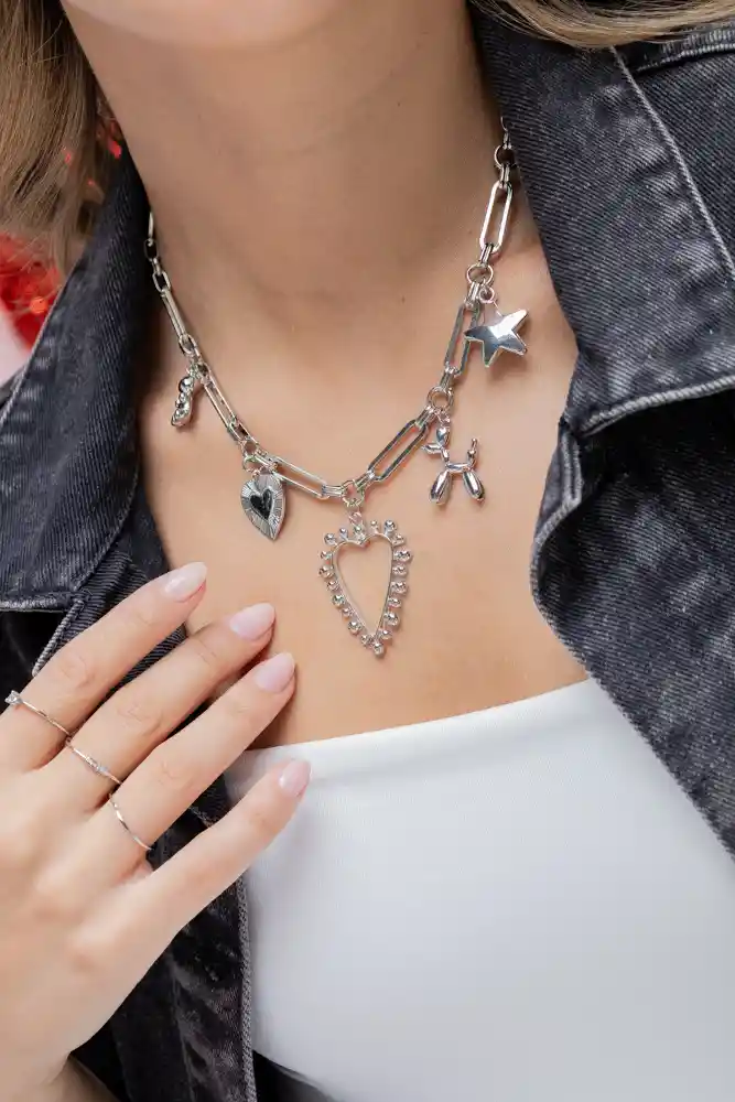 Cadena en acero plateado. Incluye: 1 cadena con varios dijes como se ve en la foto. Incluye aretes tipo topos (aretes pequeños), el diseño del arete te llegará según disponibilidad. Recibe con tu compra una FLORIBAG gratis, para que guardes por separado tus accesorios. Hecho a mano en Colombia. * Las imágenes pueden estar ambientadas con otros productos que se venden por separado