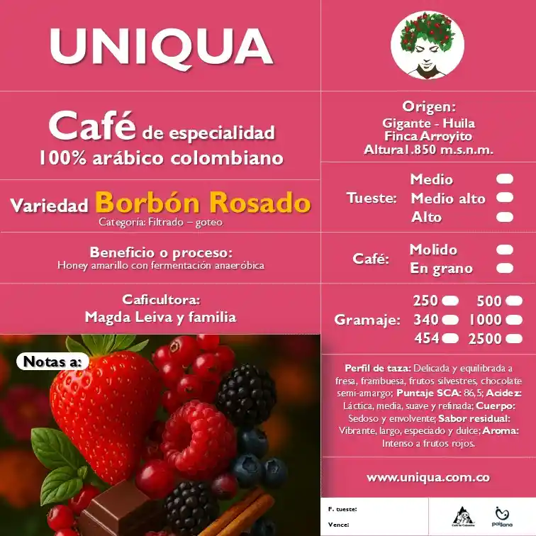 Perfil de taza: Delicada y equilibrada a fresa, frambuesa, frutos silvestres, chocolate semi-amargo Acidez: Láctica, media, suave y refinada Cuerpo: Sedoso y envolvente Sabor residual: Vibrante, largo, especiado y dulce Aroma: Intenso a frutos rojos. Café producido 100% por mujeres. Somos café de Colombia y PaisSana: Café de territorios de paz. Puntaje SCA 86.5