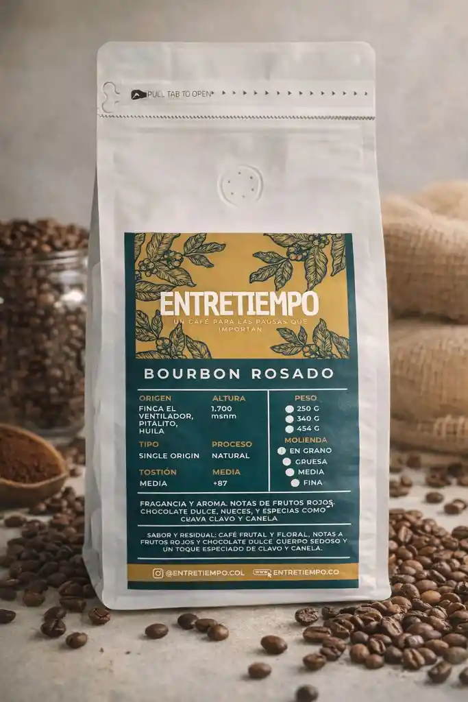 🌺 Bourbon Rosado – Proceso Natural | Pitalito, Huila Origen: Finca El Ventilador, Pitalito – Huila Altura: 1.700 msnm Variedad: Bourbon Rosado Proceso: Natural Tipo: Single Origin Tostión: Media Puntaje SCA: +87 Este Bourbon Rosado de Pitalito es una taza expresiva y sofisticada, donde el proceso natural potencia un perfil frutal intenso, acompañado de dulzor profundo y una complejidad especiada muy característica. En fragancia y aroma se destacan notas de frutos rojos, chocolate dulce y nueces, complementadas por un fondo especiado de clavo y canela que aporta calidez y profundidad. En boca, es un café floral y frutal al tiempo, con notas marcadas a frutos rojos y chocolate dulce. Su cuerpo es sedoso, envolvente, y su perfil se complementa con un sutil toque especiado de clavo y panela que le da una identidad distintiva. El residual es limpio, persistente y ligeramente dulce, dejando una sensación cálida y prolongada. ☕ Ideal para quienes disfrutan cafés complejos, frutales y con notas especiadas. Se expresa muy bien en métodos filtrados como V60, Kalita o Chemex, donde su claridad y dulzor se equilibran con su carácter.
