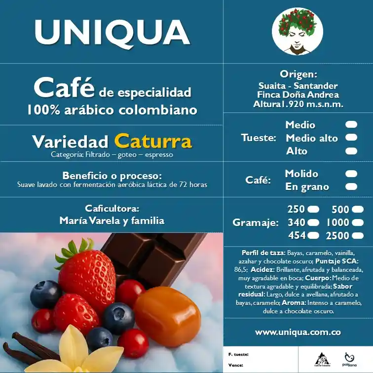 Café arábico 100% colombiano, variedad: Caturra (variedad fuerte, a chocolate y caramelo), tueste medio, en grano, 340 gramos beneficio o proceso: suave lavado fermentación aeróbica por 72 horas origen: Suaita - Santander, altitud: 1.920 m.s.n.m., Caficultora: María Varela y familia. Descripción del perfil en taza: Bayas, caramelo, vainilla, azahar y chocolate oscuro Acidez: Brillante, afrutada y balanceada, muy agradable en boca Cuerpo: Medio de textura agradable y equilibrada Sabor residual: Largo, dulce a avellana, afrutado a bayas, caramelo Aroma: Intenso a caramelo, dulce a chocolate oscuro. Café producido 100% por mujeres rurales. Somos café de Colombia y PaisSana: Café de territorios de paz. Puntaje SCA: 86.5