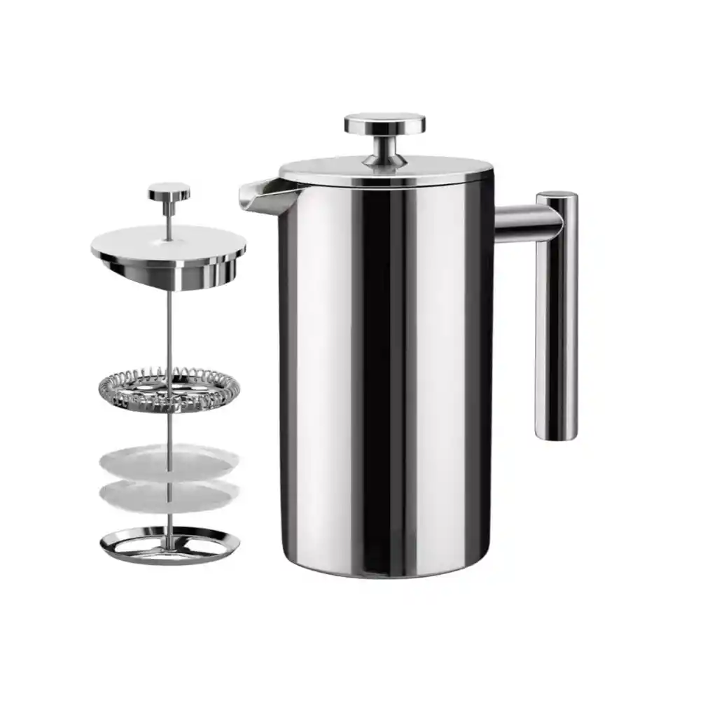 Moderna, elegante y práctica Prensa Francesa completamente en Acero Inoxidable con capacidad de 350 ml, doble filtro de acero inoxidable para una mejor extracción y menos solutos en tu bebida, y estructura doble pared que mejora la preservación de la temperatura en el café mientras la hace más fría al tacto. Disfruta preparando tu propio café con este sencillo método, ideal para la oficina, la casa o casi cualquier lugar. Emplea café preferiblemente con molienda gruesa, agua cercana a los 90°C, espera aproximadamente 4 minutos y luego baja el émbolo para filtrar el café y disfrutar una deliciosa taza de café preparada por ti. Material: Acero Inoxidable Capacidad: 350 ml Filtro: Acero inoxidable Estructura: Doble pared Importante no es para colocar al fuego!