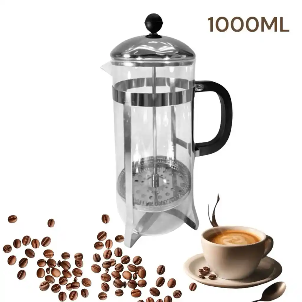 CAFETERA PRENSA 1000 ml -G53 Con un diseño elegante para el café perfecto, filtro de malla fina que retiene los sedimentos, y vaso de vidrio resistente a altas temperaturas, nuestra prensa francesa con filtro en acero inoxidable es tu mejor opción. Nuestra Prensa Francesa está diseñada para preparar cafés con el mejor sabor y textura. Si eres amante del café, La prensa francesa te va a encantar, además de su hermoso diseño y su elegante acabado cuenta con algunas características que te aseguran un infusión excepcional. Su carcasa hace que esta prensa francesa sea un elemento decorativo más de tu cocina u oficina. Su vaso de vidrio resistente a altas temperaturas te permite observar el proceso de infusión y controlar el tiempo de extracción con precisión. Su filtro de acero inoxidable no sólo retiene los sedimentos, sino que también permite que los aceites esenciales del café pasen a través, resultando en una bebida de café con cuerpo y sabor intenso. Capacidad 1000 ml