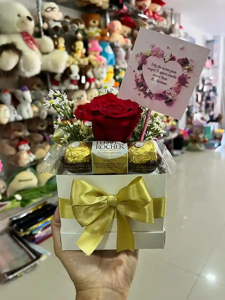 Caja 10x10 con una rosa y Ferrero x 3, colores sujeto a cambio.
